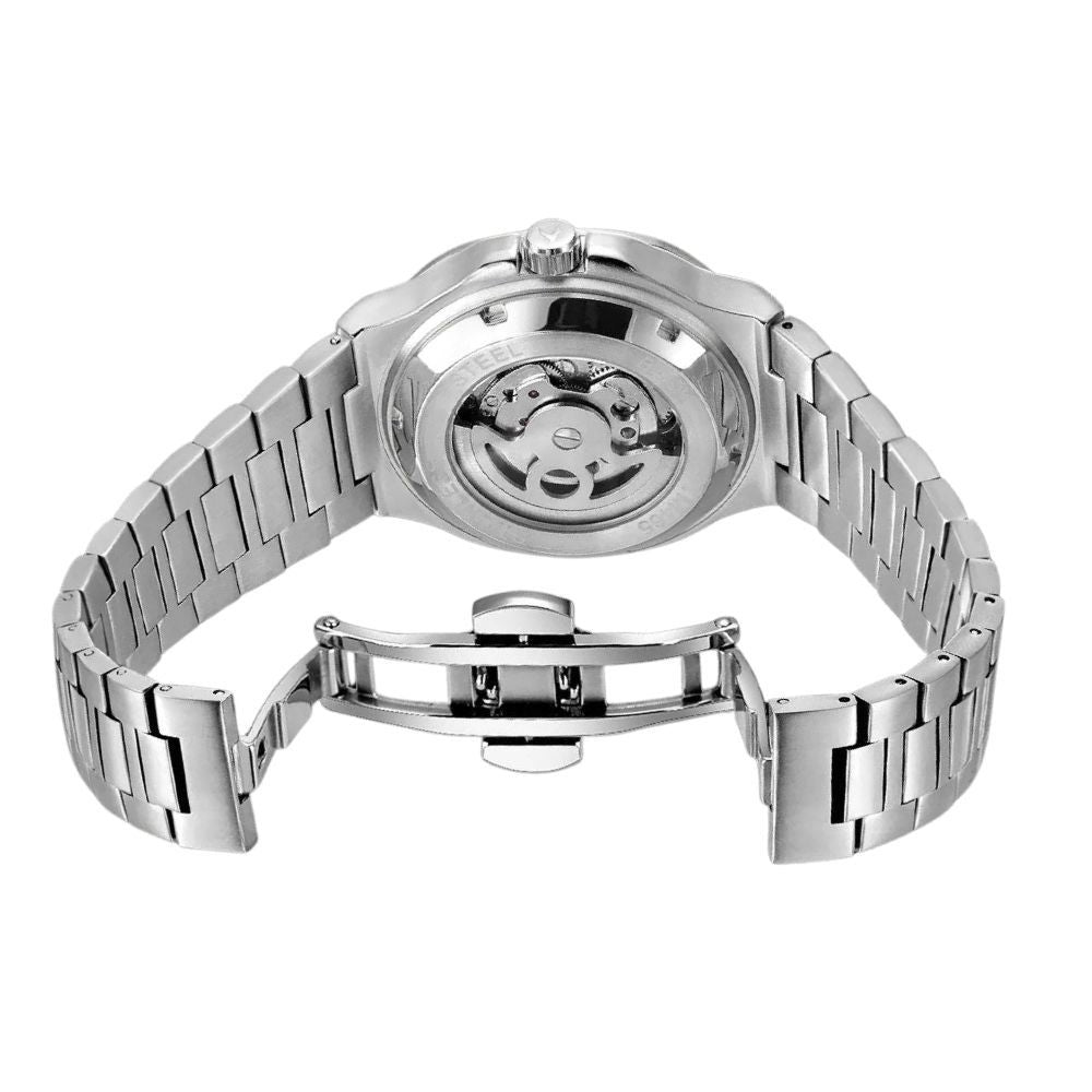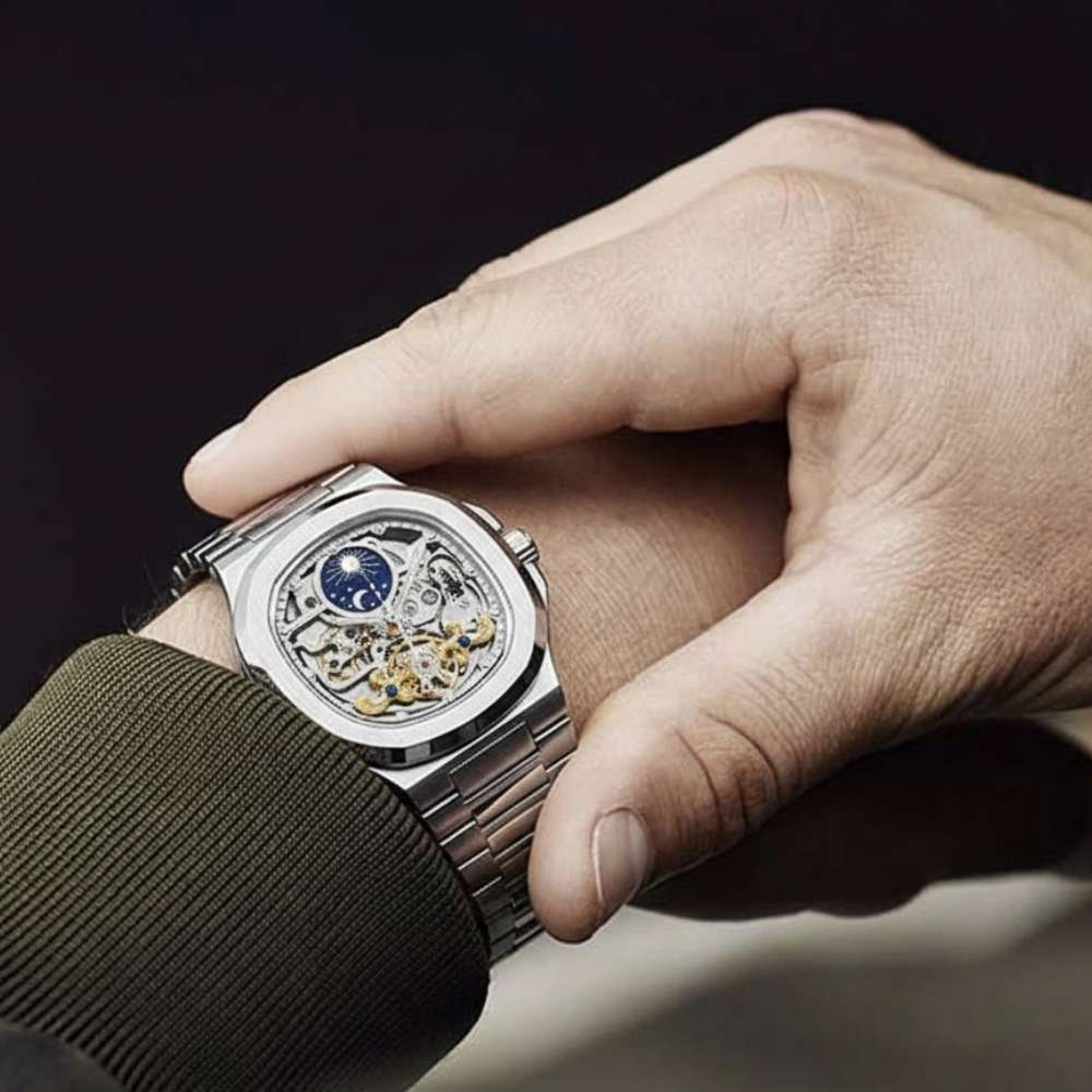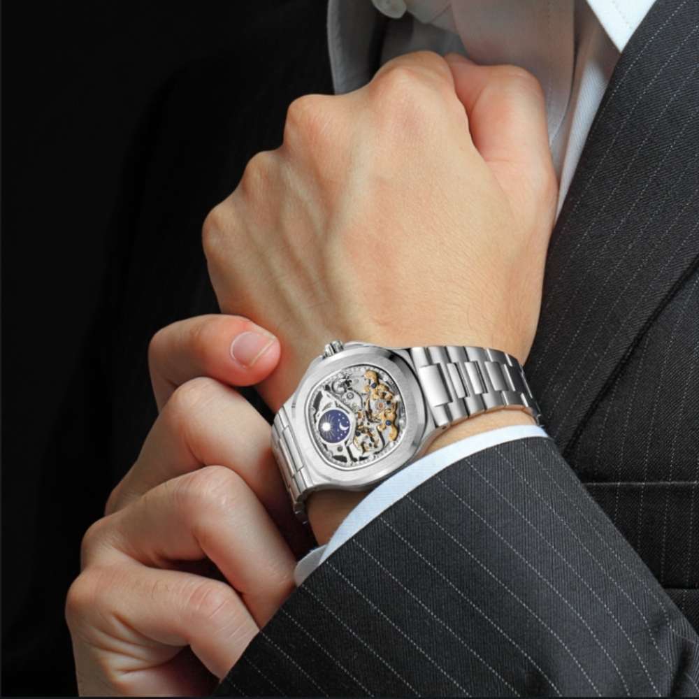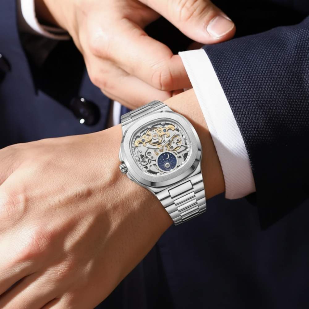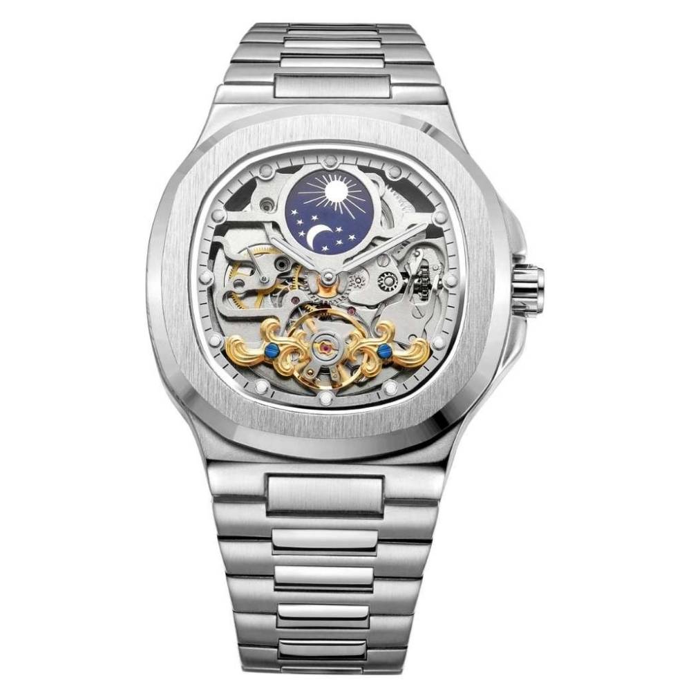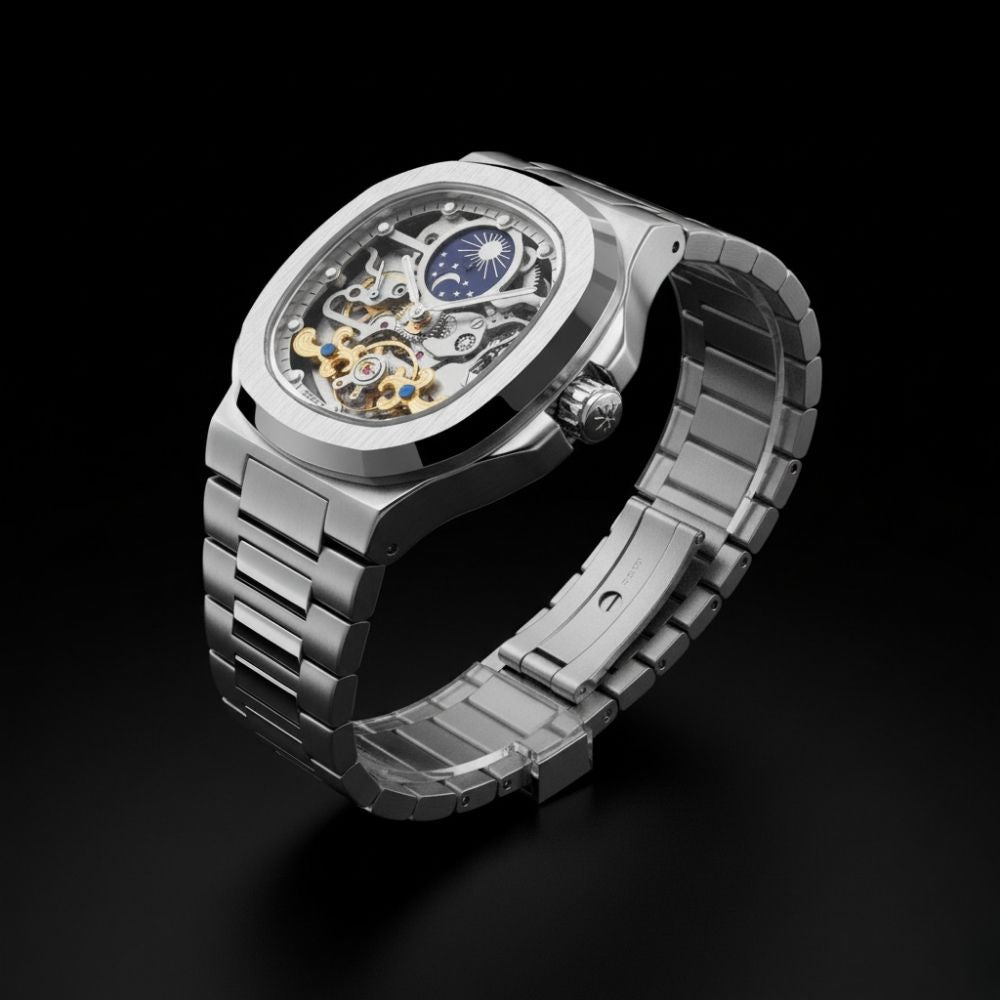 Vanguard Eclipse Argent showcases a striking stainless steel bracelet with a skeleton dial that reveals its intricate mechanics. This luxury watch combines durability, elegance, and precision. A timeless statement piece designed for sophistication and modern style.