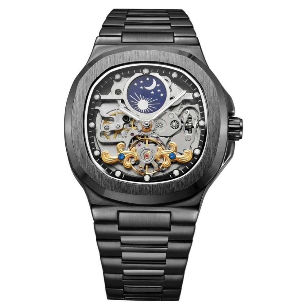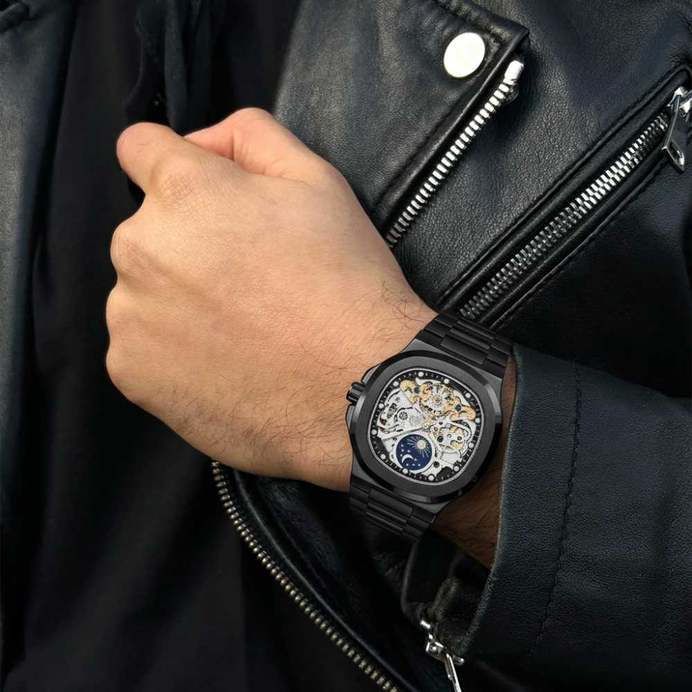 Dark and commanding, the Vanguard Eclipse Onyx in black stainless steel redefines masculine elegance. A perfect balance of strength and style.