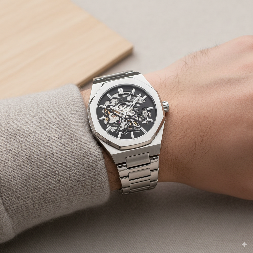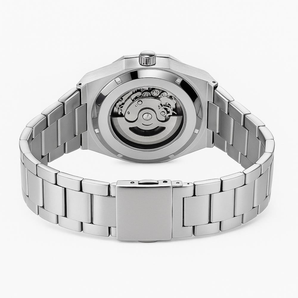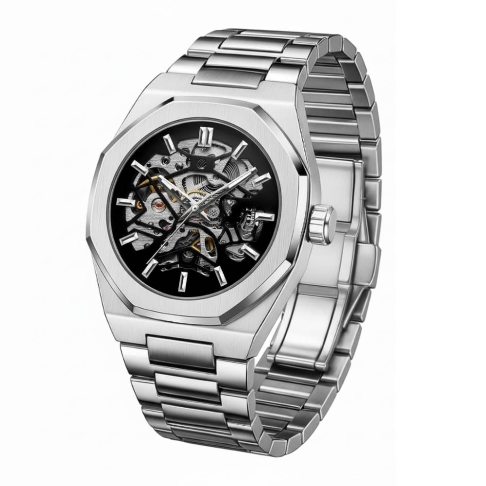 The Vanguard Titan embodies strength and precision with its bold stainless-steel design and open-worked skeleton dial. A statement of power and sophistication, it reflects the essence of modern masculinity.