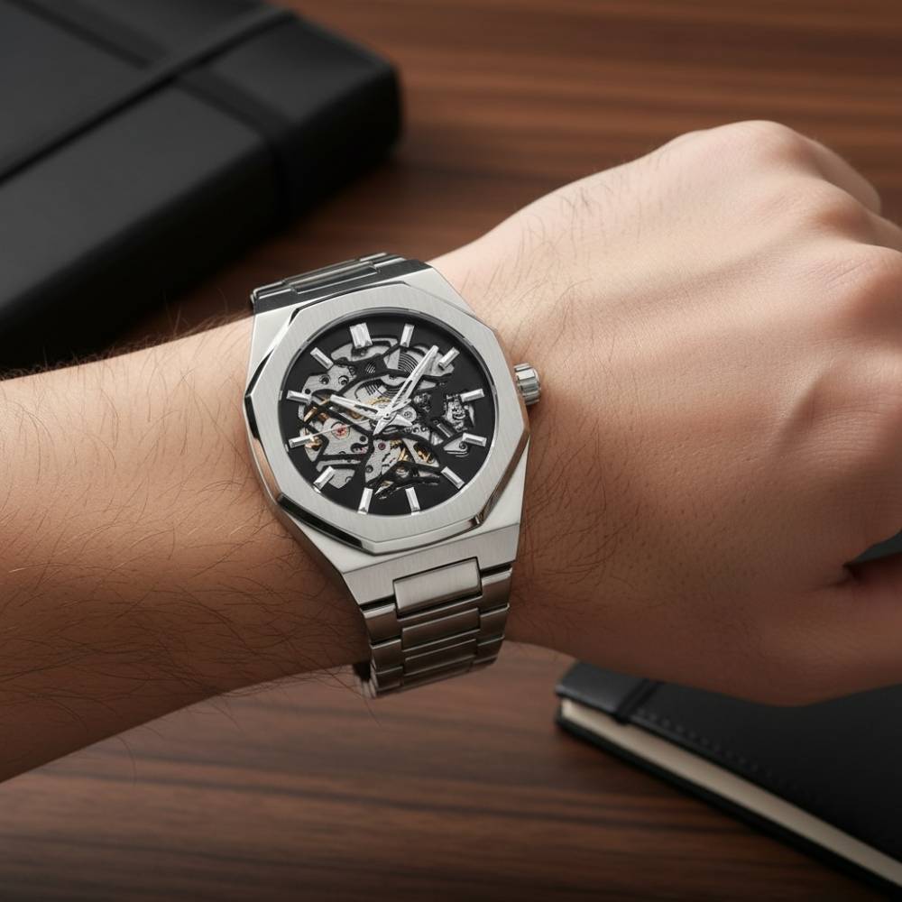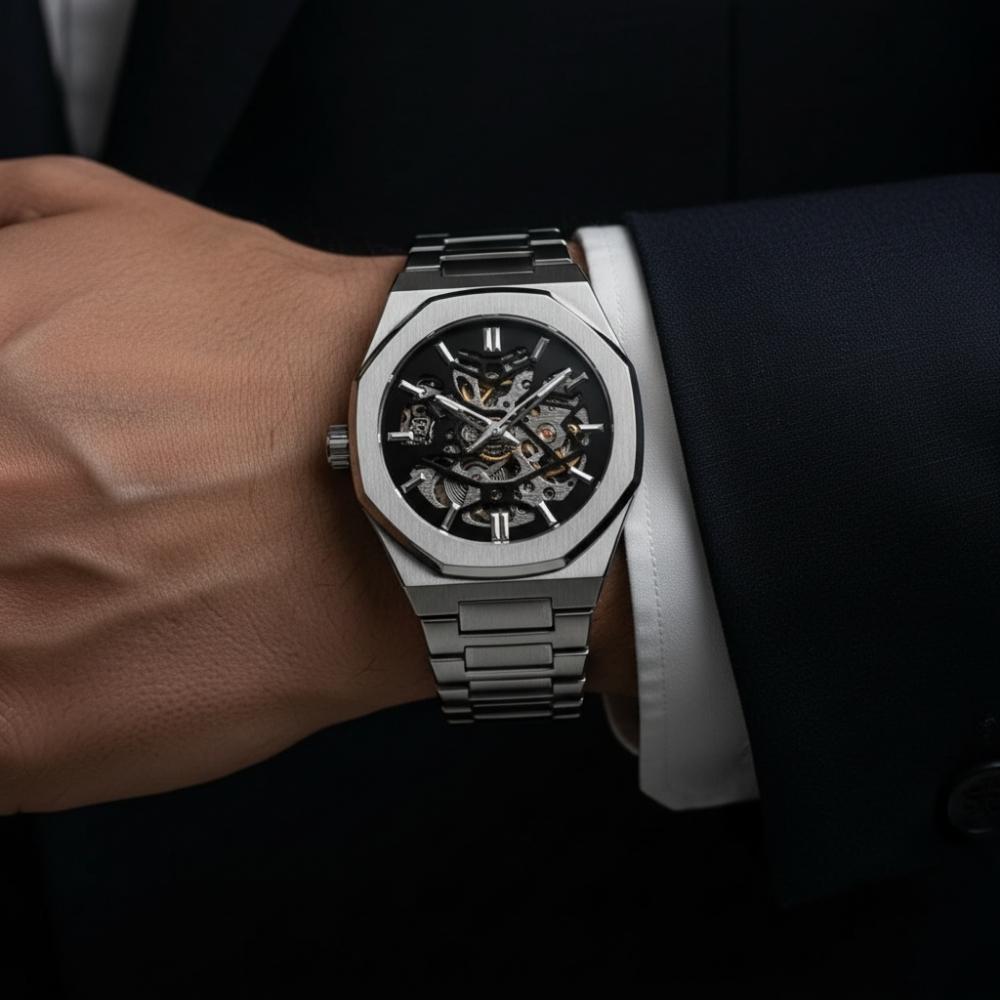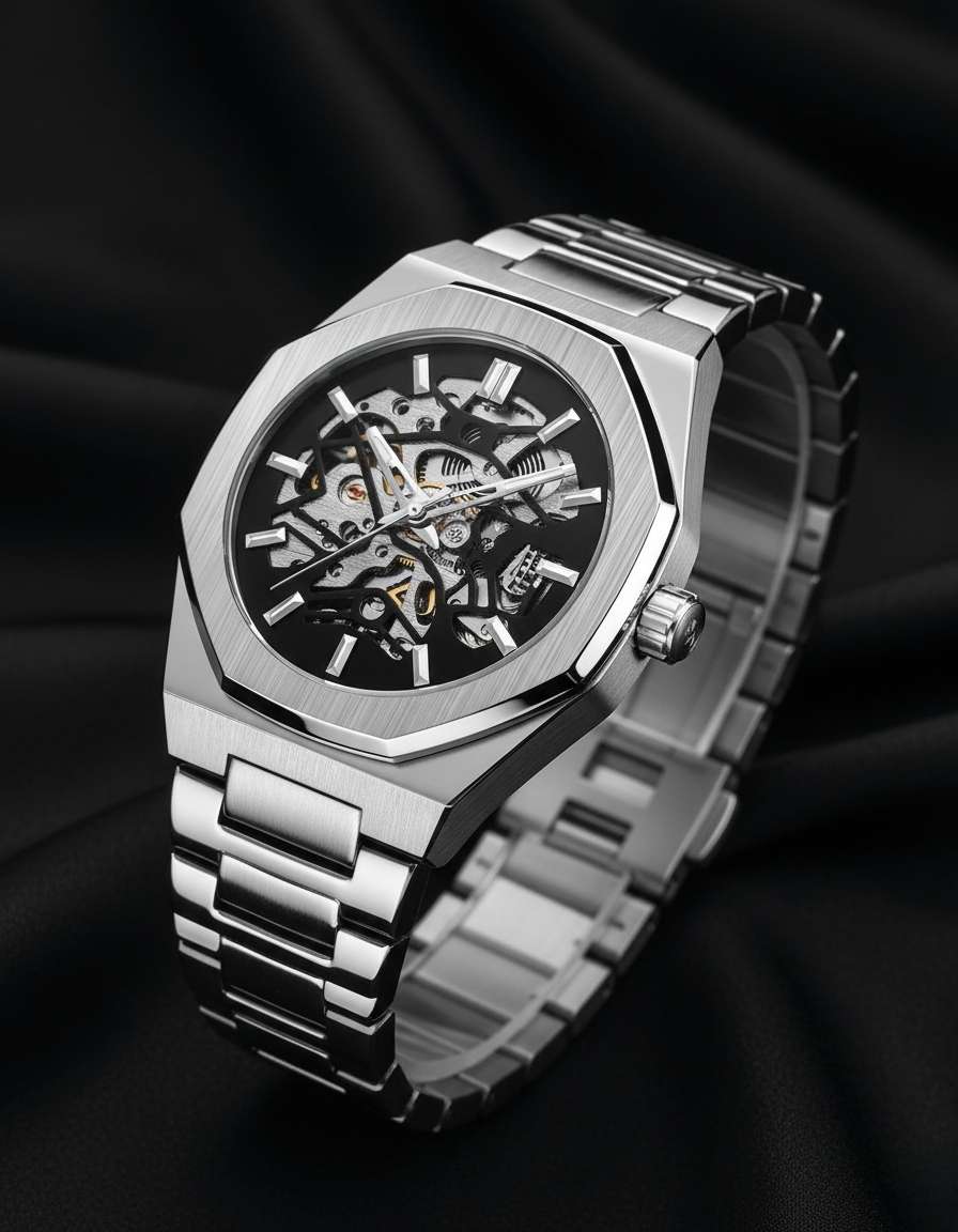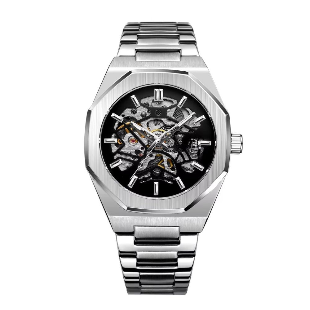 The Vanguard Titan embodies strength and precision with its bold stainless-steel design and open-worked skeleton dial. A statement of power and sophistication, it reflects the essence of modern masculinity.