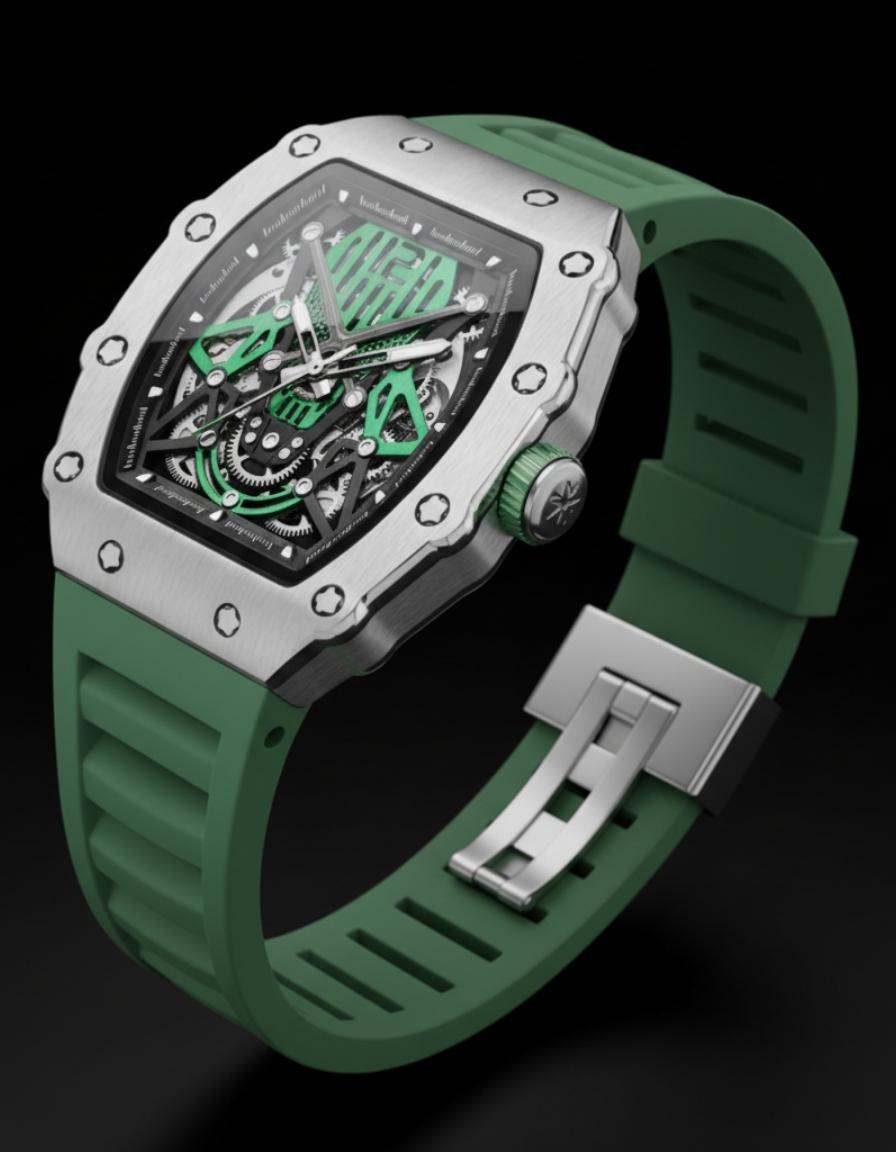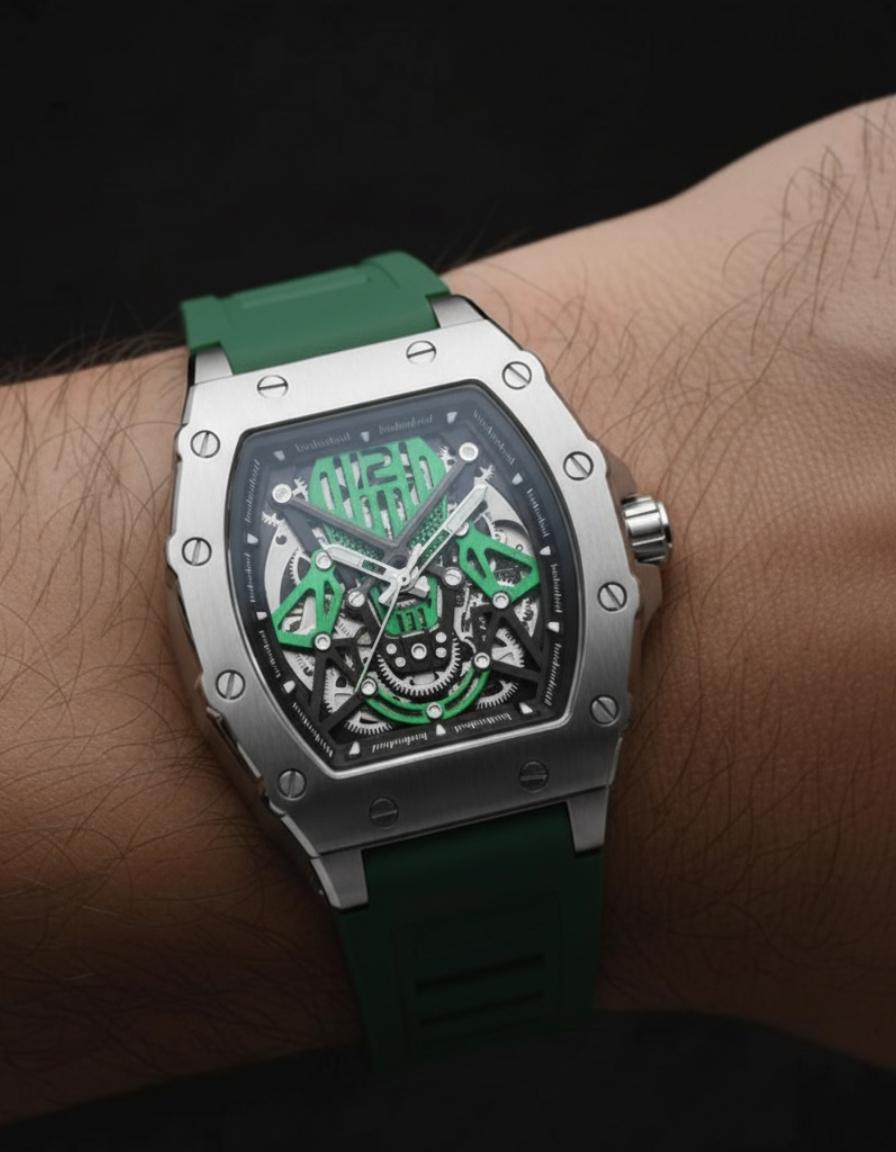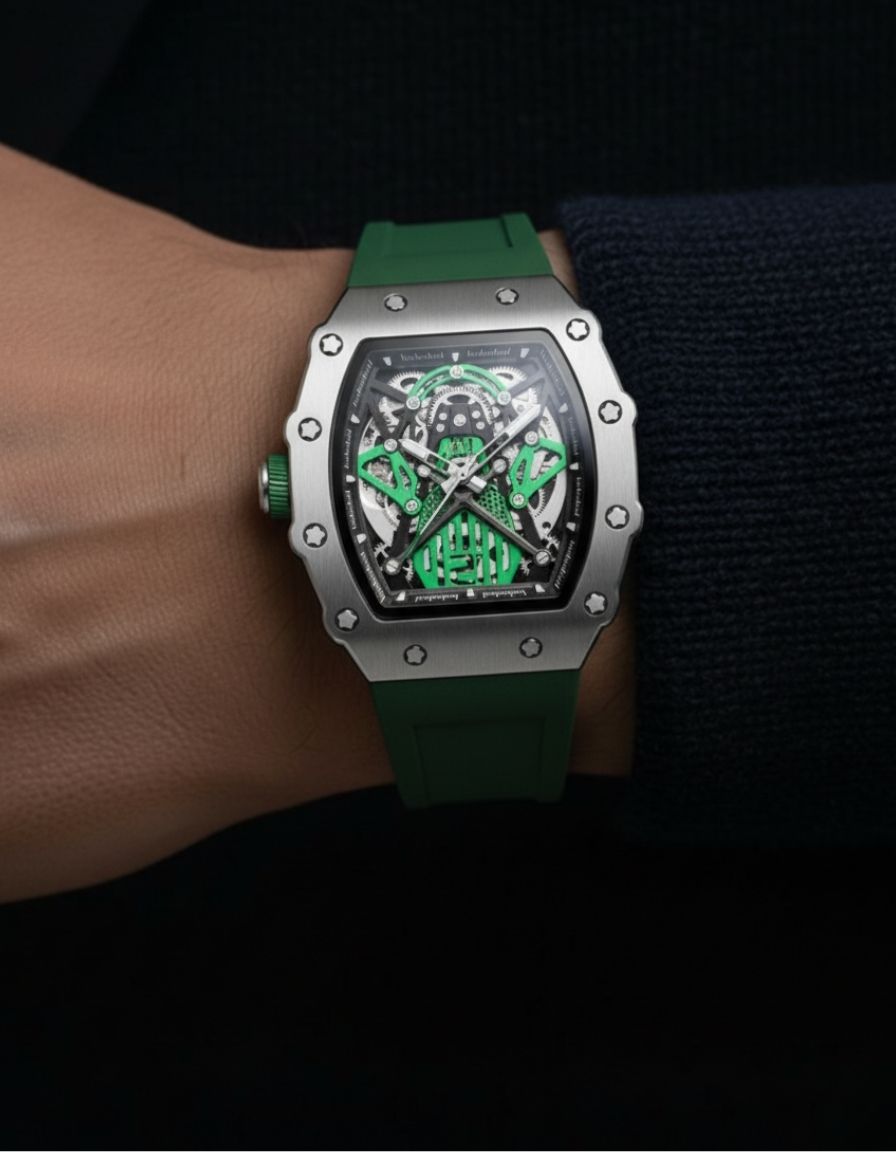 Vanguard Vortex Green delivers bold style with its striking orange rubber strap and skeletonized dial. Designed for modern watch enthusiasts, it blends durability, precision, and a dynamic look. A standout timepiece that embodies energy and sophistication.